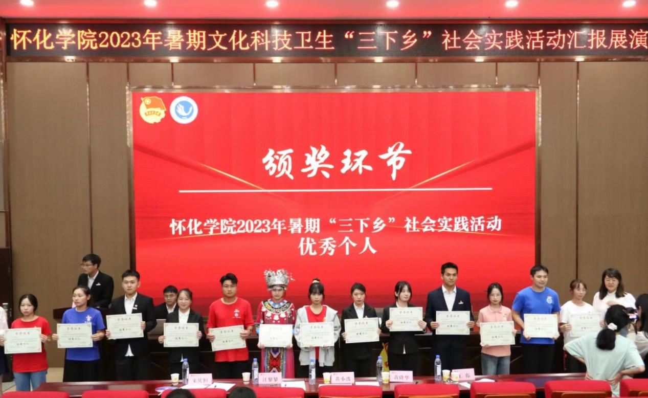 本网讯(记者 周玉茜)为总结经验、树立典型,进一步激发我校广大青年学生参与社会实践的积极性、主动性和创造性。2023年9月25日,怀化学院团委在知行楼报告厅a505举行“怀化学院2023年暑期文化科技卫生‘三下乡’社会实践活动——‘实践归来话成长’汇报展演”活动。黄小波、汪黎黎、黄隆华、宋庆恒、王伟等5位评委老师出席,校团委老师以及各院部师生代表现场观看汇报展演。