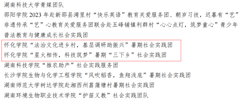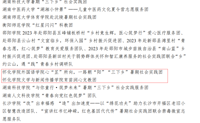 本网讯(记者 李颖)近日,共青团中央青年发展部、中国青年报、中国青年网公布2023年全国大中专学生志愿者暑期文化科技卫生“三下乡”社会实践“镜头中的三下乡”征集活动结果公布,我校外国语学院心“芷”所向,一路朝“阳”三下乡暑期社会实践团、文学与新闻传播学院育苗润心支教团队获“优秀文字团队”荣誉称号;法学与公共管理学院“法治文化进乡村,基层调研助振兴”暑期社会实践团、计算机与人工智能学院(软件学院)“星火相传,科技筑梦”暑期三下乡社会实践团获“优秀视频团队”称号。