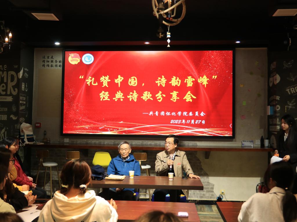 本网讯(记者 何云)为引导广大师生走进名家、走进经典, 11月27日下午,怀化学院团委在东校区图书馆二酉书吧举行“礼赞中国,诗韵雪峰”经典诗歌分享会。中国作家协会会员、中国当代艺术协会终身名誉主席龙彼德老师受邀出席,怀化学院党委副书记、校长董正宇莅临现场,各院部学生代表参加。