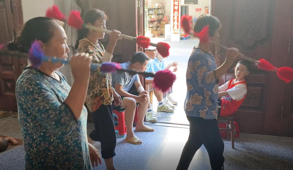78岁的谭爷爷热情地为队员们介绍“霸王鞭”的渊源:“这霸王鞭传承百余年啦,以前苗家儿女庆丰收、迎佳节时就会跳,鞭上彩绸选正红、明黄,就图个喜庆。”正说着,屋内几位苗族奶奶手持霸王鞭起身,伴随着《踩堂歌》的旋律翩翩起舞。只见鞭梢轻点膝盖,再反手击向手肘,红绸在空中翻飞,鞭身与骨节碰撞出清脆的节奏,霸王鞭的叮当声与歌声交织,弥漫在整个院落。几位苗族奶奶现场表演,伴随着《踩堂歌》旋律,舞动霸王鞭。实践团成员专注记录动作细节,用手机拍摄视频留存资料,并与奶奶们深入交流,询问动作要领与传承困境。