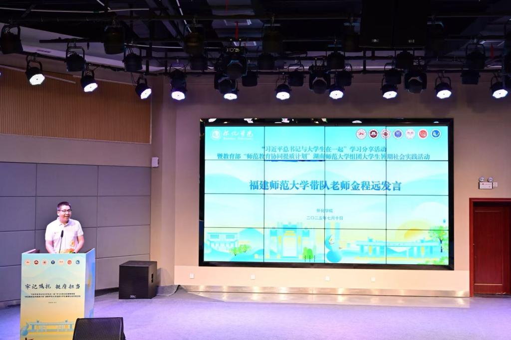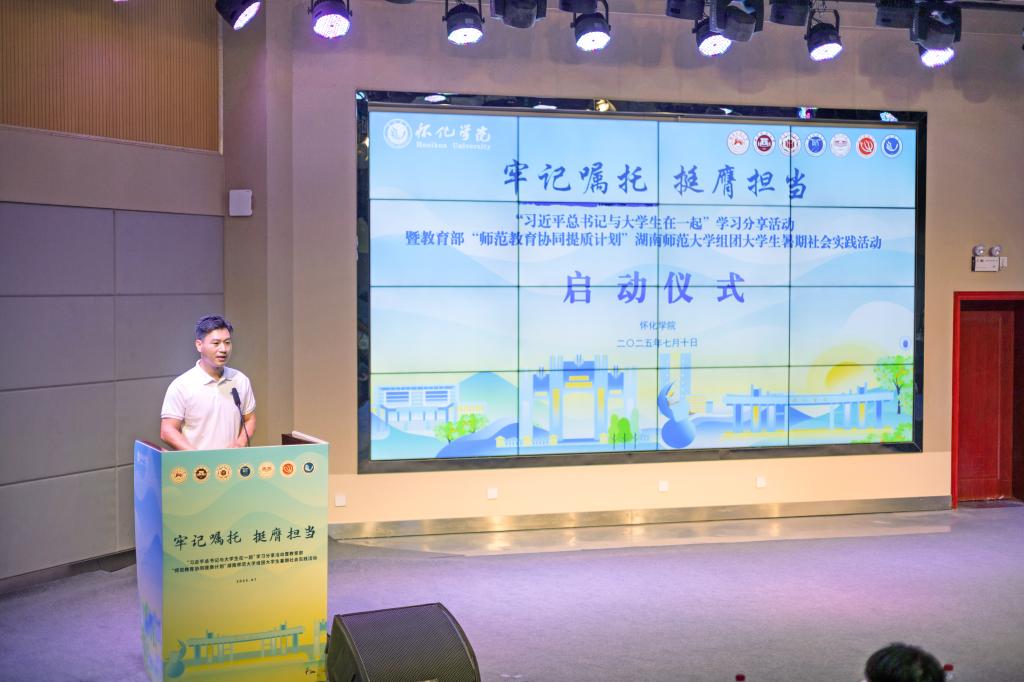 本网讯(记者何 云 赵海迪 廉佳庆)2025年7月10日晚,牢记嘱托 挺膺担当“习近平总书记与大学生在一起”学习分享活动暨教育部“师范教育协同提质计划”湖南师范大学组团暑期社会实践活动于湖南怀化拉开帷幕,此次活动由怀化学院承办,活动启动仪式在我校东校区逸夫楼演播厅举行。我校党委委员、副校长周小李、团委书记黄小波、教务处副处长黄隆华、湖南师范大学、福建师范大学、闽南师范大学、宁夏师范大学、湖南第一师范学院、长沙师范学院带队老师和同学们与会。