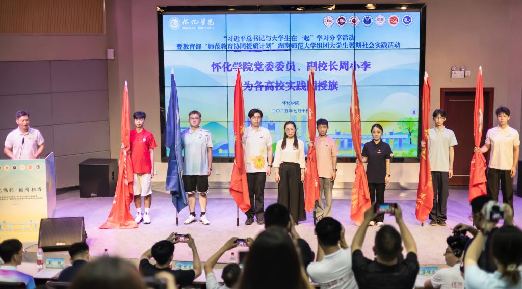 高校带队教师福建师范大学金程远、学生代表怀化学院谭芳晴分别发言。怀化学院党委委员、副校长周小李为各高校社会实践团队授旗并宣布活动正式启动。
