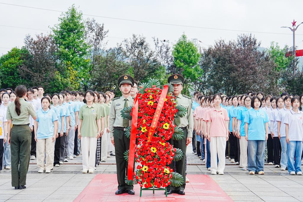 通道转兵纪念馆广场前,全体师生肃立举行授花仪式,向不朽的英魂深深鞠躬,缅怀先辈事迹,瞻仰伟人之姿。